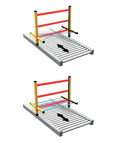 Barriera di sicurezza per controllo accessi con funzioni di Muting integrate. Restart automatico/manuale selezionabile e EDM. Logica di Muting T (entrata-uscita). Raggi paralleli