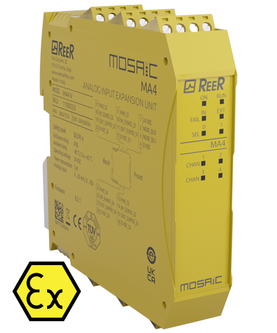 Modulo di espansione ingressi analogici. Soddisfa le seguenti Normative Atex: 2014/34/EU; EN IEC 60079-0:2018; EN 60079-7:2015; UL 121201; CSA C22.2 No. 213-17. 4 ingressi analogici. Elettronica tropicalizzata. Morsettiere terminali a vite