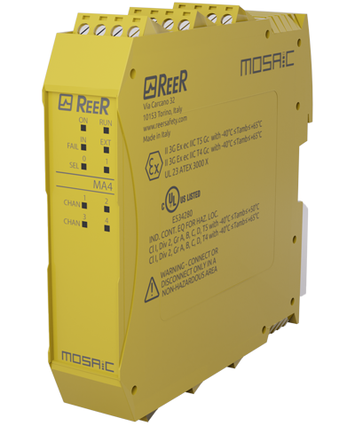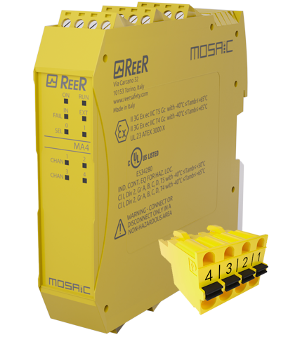Modulo di espansione ingressi analogici. Soddisfa le seguenti Normative Atex: 2014/34/EU; EN IEC 60079-0:2018; EN 60079-7:2015; UL 121201; CSA C22.2 No. 213-17. 4 ingressi analogici. Elettronica tropicalizzata. Morsettiere terminali a molla