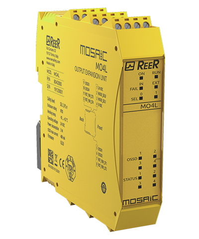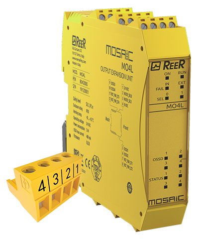 Modulo di espansione uscite. 4 uscite singole OSSD o 2 coppie (SIL 3). Morsettiere terminali a vite