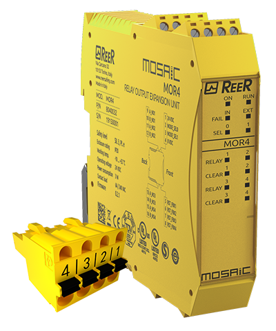 Modulo di espansione relè di sicurezza. 4 relè di sicurezza con uscite configurabili. Morsettiere terminali a molla