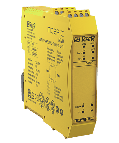 Modulo di espansione per controllo in sicurezza della velocità. 2 ingressi per proximity switch. Morsettiere terminali a molla