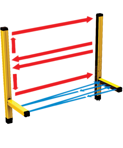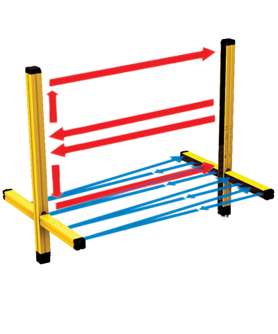 Barriera di sicurezza per controllo accessi con funzione di Muting integrata. Restart automatico/manuale selezionabile e EDM. Con elementi passivi retro-riflettenti (TRX)