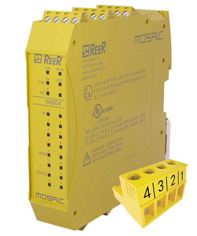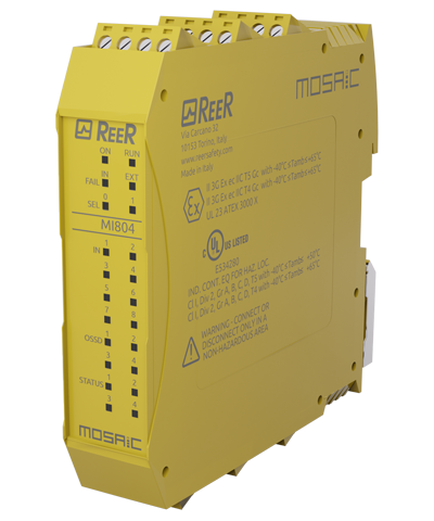 Additional I/O Expansion Unit. Meets the following Atex Standards: 2014/34/EU; EN IEC 60079-0:2018; EN 60079-7:2015; UL 121201; CSA C22.2 No. 213-17. 8 Inputs max current consumption 4mA. 4 single or 2 pairs OSSD (SIL 3). Conformal coating of the electronic boards. Screw Terminal Blocks